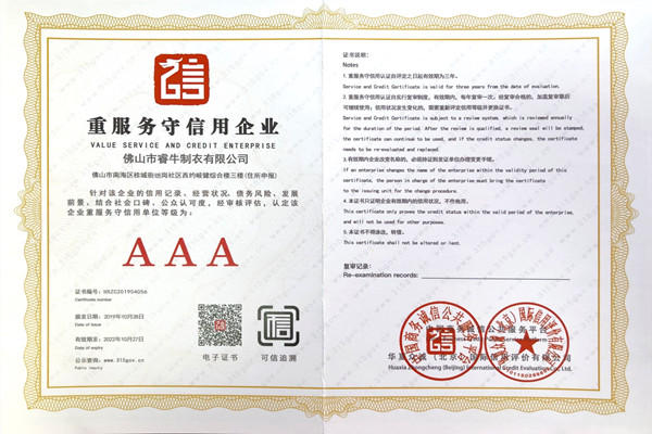 佛山市睿牛制衣有限公司——3A級重服務守信用企業(yè);