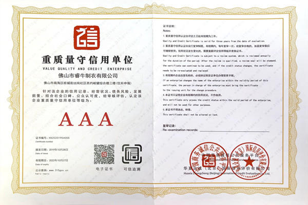佛山市睿牛制衣有限公司——3A級質量服務誠信單位;