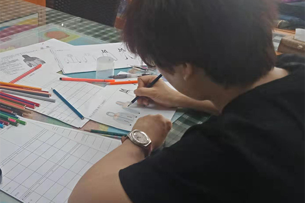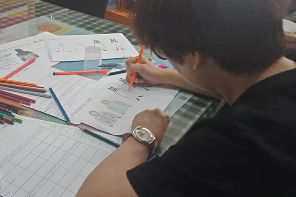 盡管困難重重,我們也要想進(jìn)一切辦法做到,不僅要做好,而且要做到最好!我們的總經(jīng)理自己也搖身一變設(shè)計師——畫稿,可以看到以下的圖片,認(rèn)真、負(fù)責(zé)的態(tài)度,用心的為客戶所思,一筆一筆的畫好,一點點的涂好顏色;還有一個紙樣哥哥也在幫忙畫,他們兩個人在一兩天的時間內(nèi)要畫好接近10個款衣服和褲子,雖然我們的時間不多,但是睿牛的小伙伴們也是很努力的去做,努力過就不曾后悔。