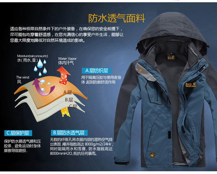 3、防風性。100%防止空氣冷卻效果。在多變的自然環境中,夾克不應該讓冷風穿透我們的衣服,吹走皮膚附近的溫暖空氣。專業的夾克應該在中下部有防風裙,或者防風腳,防止風從下擺灌進夾克,還有內置的防風帽,需要的時候可以隨時拿出來戴上。