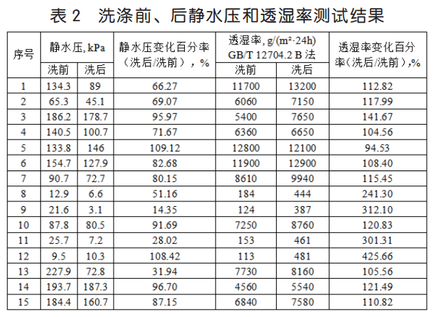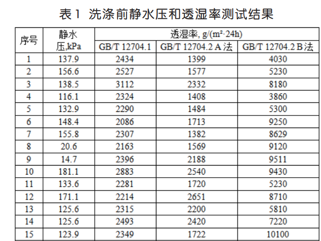 以筆者所在的檢測(cè)機(jī)構(gòu)為例,收集了一定時(shí)間內(nèi)的沖鋒衣面料檢測(cè)樣品,共計(jì) 50 個(gè),其中 35 個(gè)樣品采用上述方法,進(jìn)行靜水壓和透濕率測(cè)試,研究不同方法之間的關(guān)系,結(jié)果見(jiàn)表 1。15 個(gè)樣品按照GB/T 32614-2016《戶外運(yùn)動(dòng)服裝 沖鋒衣》測(cè)試比較樣品洗滌前、后的靜水壓和透濕率變化,結(jié)果見(jiàn)表 2。