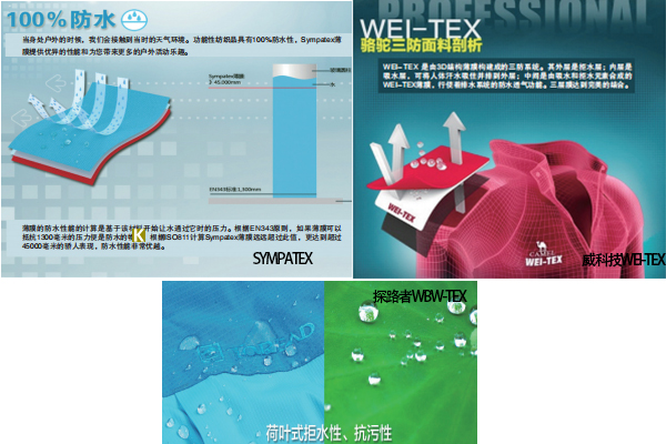 威科技WEI-TEX:WEI-TEX面料是吳江同洲紡織有限公司主打的面料品牌之一,具有良好的防風(fēng)防水及透濕透氣特性,是北京大臺北戶外及駱駝圣弗萊戶外的主打面料。WEI-TEX面料采用的是PU聚氨酯材質(zhì),這一點與大部分面料一樣。