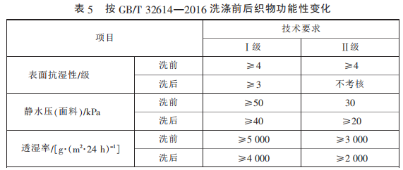 考慮到防水透濕面料功能的 耐用性,GB/T 32614—2016 中增加 了對功能性指標的洗后測試,采用 標準 GB/T 8629—2001《紡織品 試 驗用家庭洗滌和干燥程序》 中 的 5A 程 序 洗 滌 3 次 并 懸 掛 晾 干,洗 后的指標要求變化具體見表 5,相 較于洗前,指標略有降低。