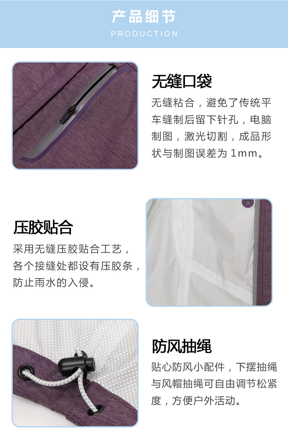 防風抽繩:貼心防風小配件,下擺抽繩與風帽抽繩可自由調節(jié)松緊度,使戶外過膠沖鋒衣更方便戶外活動。