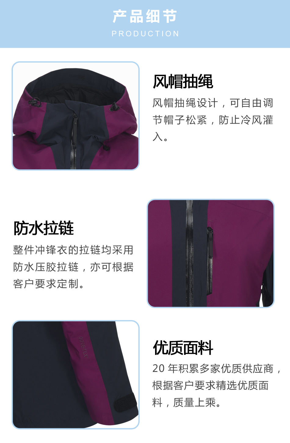 防水拉鏈:整件沖鋒衣的拉鏈均采用防水壓膠拉鏈,亦可根據(jù)客戶要求定制。