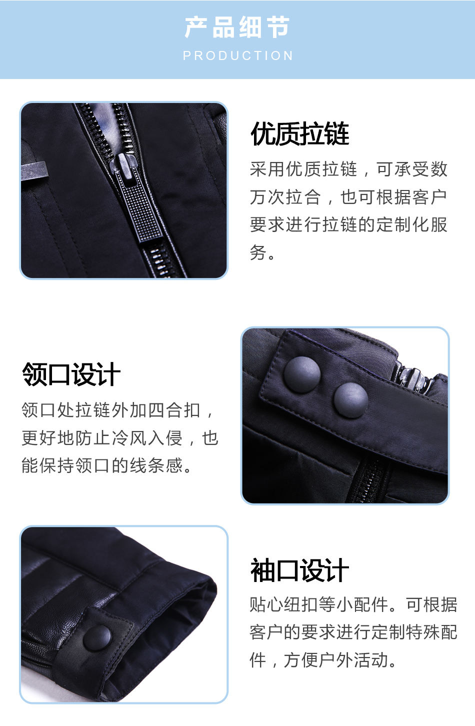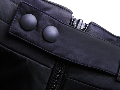 領(lǐng)口設(shè)計(jì):領(lǐng)口處拉鏈外加四合扣,更好地防止冷風(fēng)入侵,也能保持領(lǐng)口的線條感。