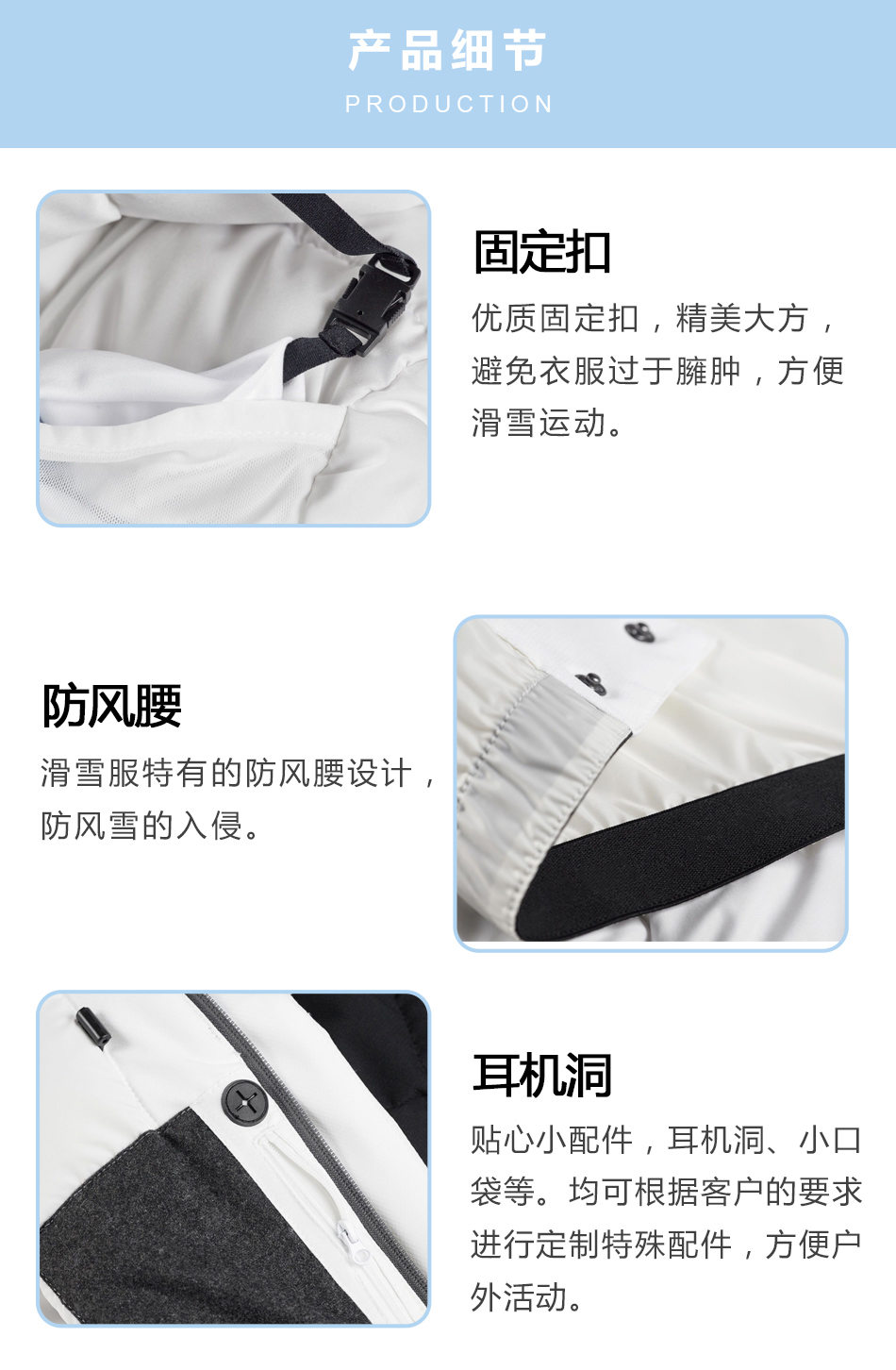 防風(fēng)腰:加厚滑雪服生產(chǎn)特有的防風(fēng)腰設(shè)計(jì),防風(fēng)雪的入侵。